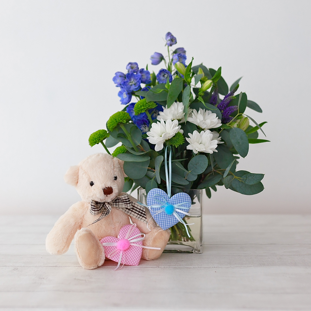 Beautiful mix of flowers suitable for a new born in a glass vase with a teddy.