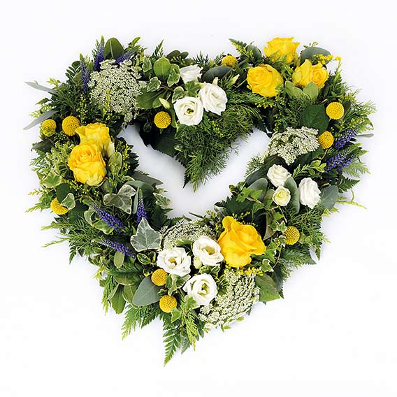 A beautiful heart tribute featuring moss base and clusters of flowers.