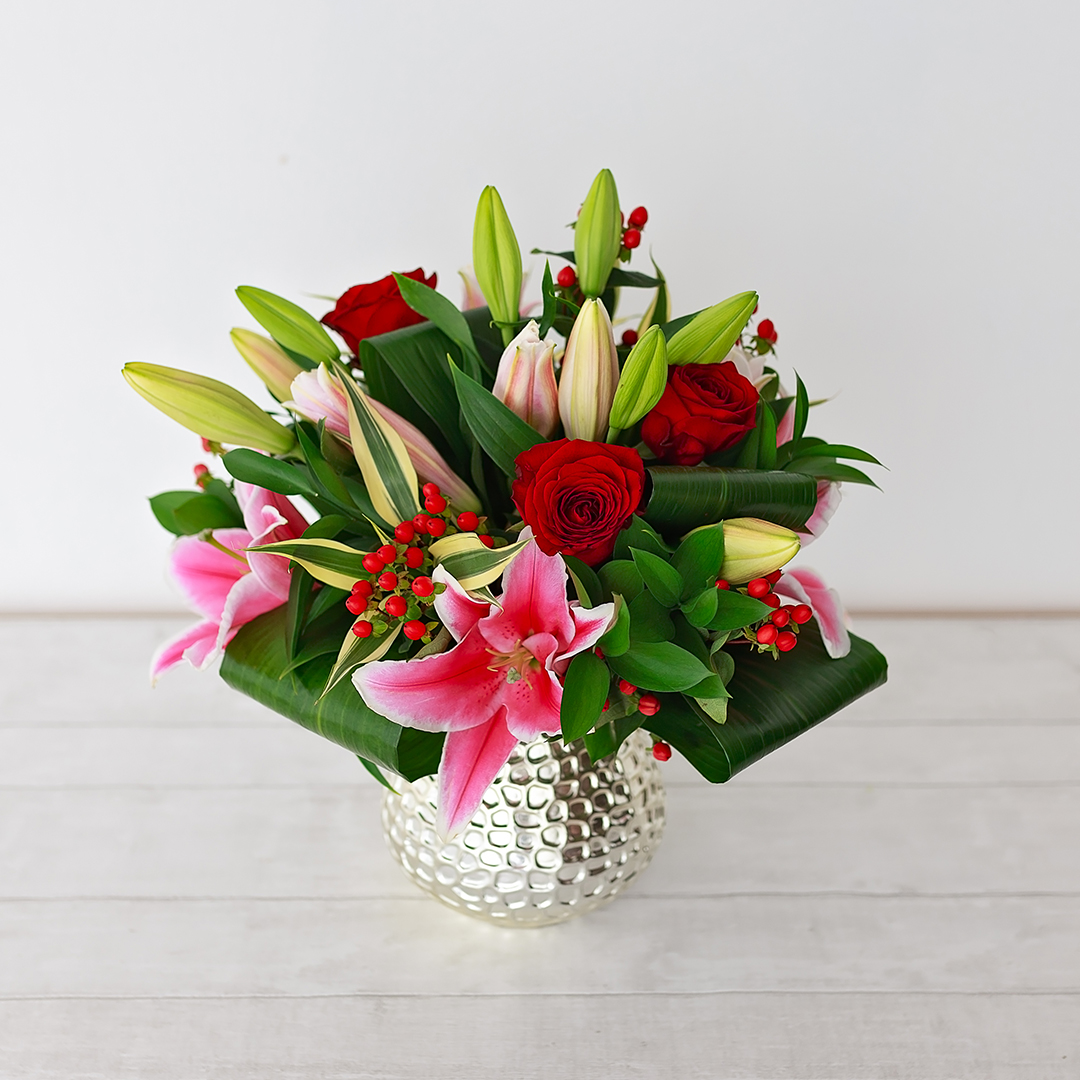 An extravagant red and pink flower bouquet, handtied with dashing red roses, stunning pink oriental lily and rich red hypericum berries, complete with rolled aspadistra leaves and displayed in a vase.