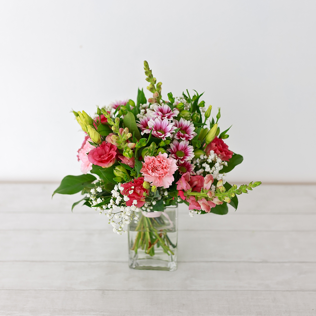 An abundant and romantic mix of blushing pink Lisianthus, Carnations, Antirrhinum, and delicate Gypsophila. Expertly arranged by our talented florists into a soft, artisan-style bouquet and beautifully presented in a vase—ready to be admired and enjoyed.