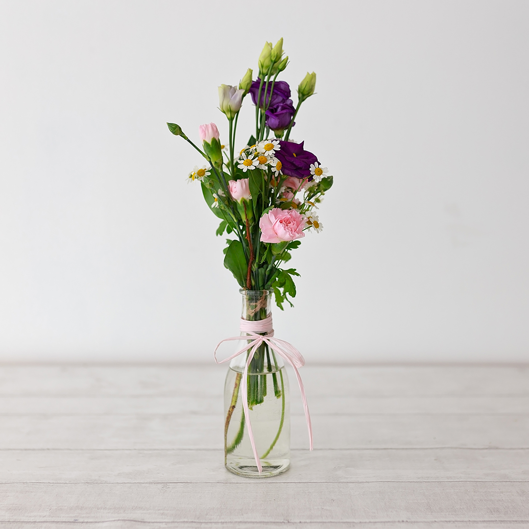 Dainty hand tie of mixed flowers displayed in a small glass bottle.