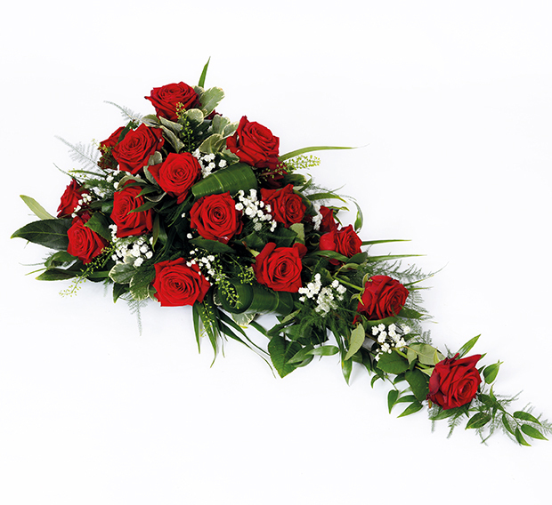An elegant display of beautiful Roses, Gypsophila and mixed foliage.